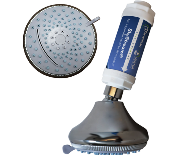 SkyStream® mounted shower heads feature an integrated hollow-fiber ultrafiltration membrane designed to reduce microbial contamination, including Legionella pneumophila, Nontuberculous Mycobacteria (NTM), E. coli, Salmonella, and other waterborne bacteria.